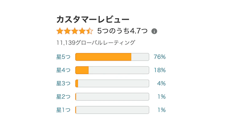 基本的にAmazonでも星5つの評価が大半で、ほとんどの購入者がその性能に満足しているようです。平均スコアは驚異の4.7で、星1をつけている人は全体の1%しかいません。