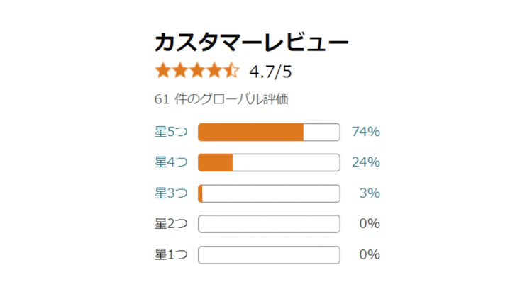 2024年9月時点で61件の合計評価、レビュー付きが56件です。低評価に当たる星1~2がありません。総じて購入者の多くがCIO SMARTCOBY Pro SLIM CABLEを満足していると想像できます。