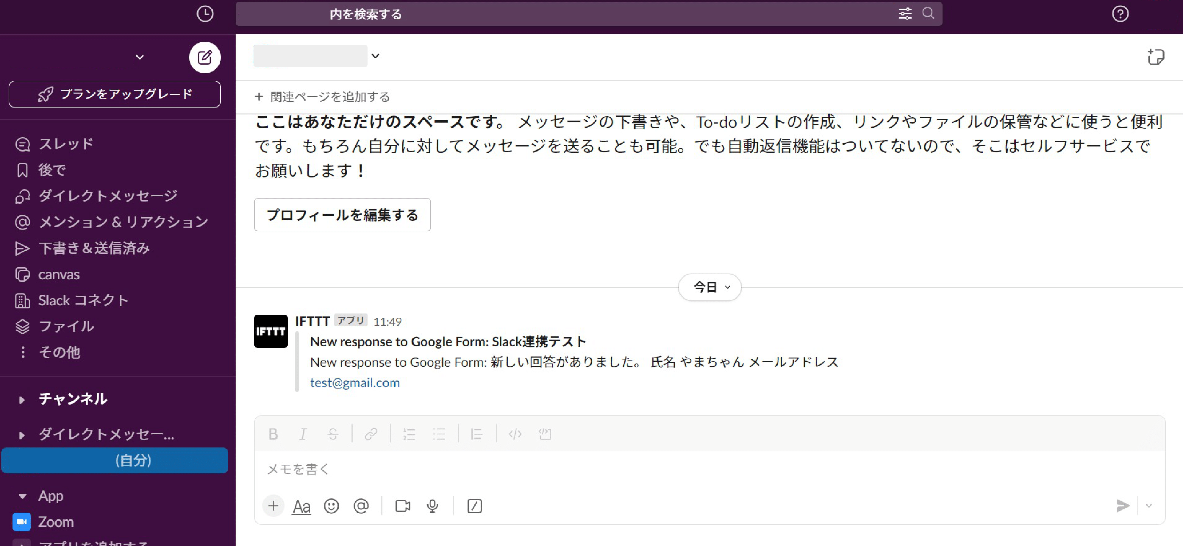しっかりとセットした内容がDMに通知されていることがわかります。今回は氏名とメールアドレスだけですが、実際はここに電話番号や希望事項等、Googleフォーム上でセットした内容を反映できるので、通知されればチーム内で瞬時に対応することが可能となります。