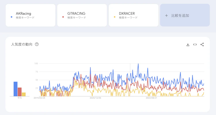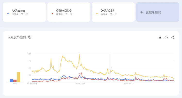 ゲーミングチェアのパイオニアとなったDXRACERですが、実は日本においては後発のAKRacingやGTRACINGに先を越されているのかもしれません。Google Trendsで過去5年の検索ボリュームを確認すると、AKRacing > GTRACING > DXRACERの順になっています。