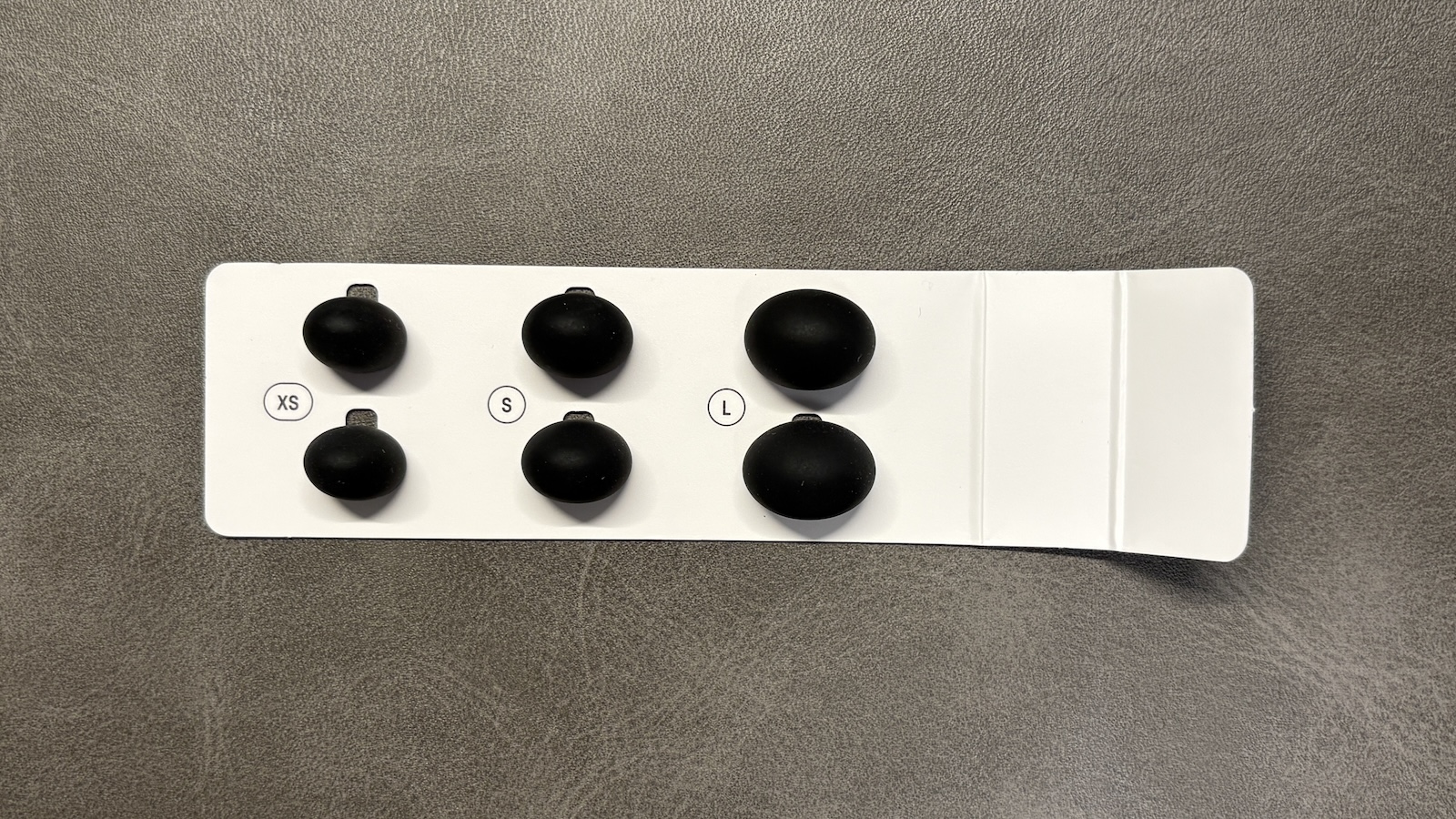 XS〜L の 4 サイズチップを順に試したところ、デフォルトの M サイズ がベストフィットでした。リングを軽くねじ込むだけで装着でき、3 秒程度で完了します。