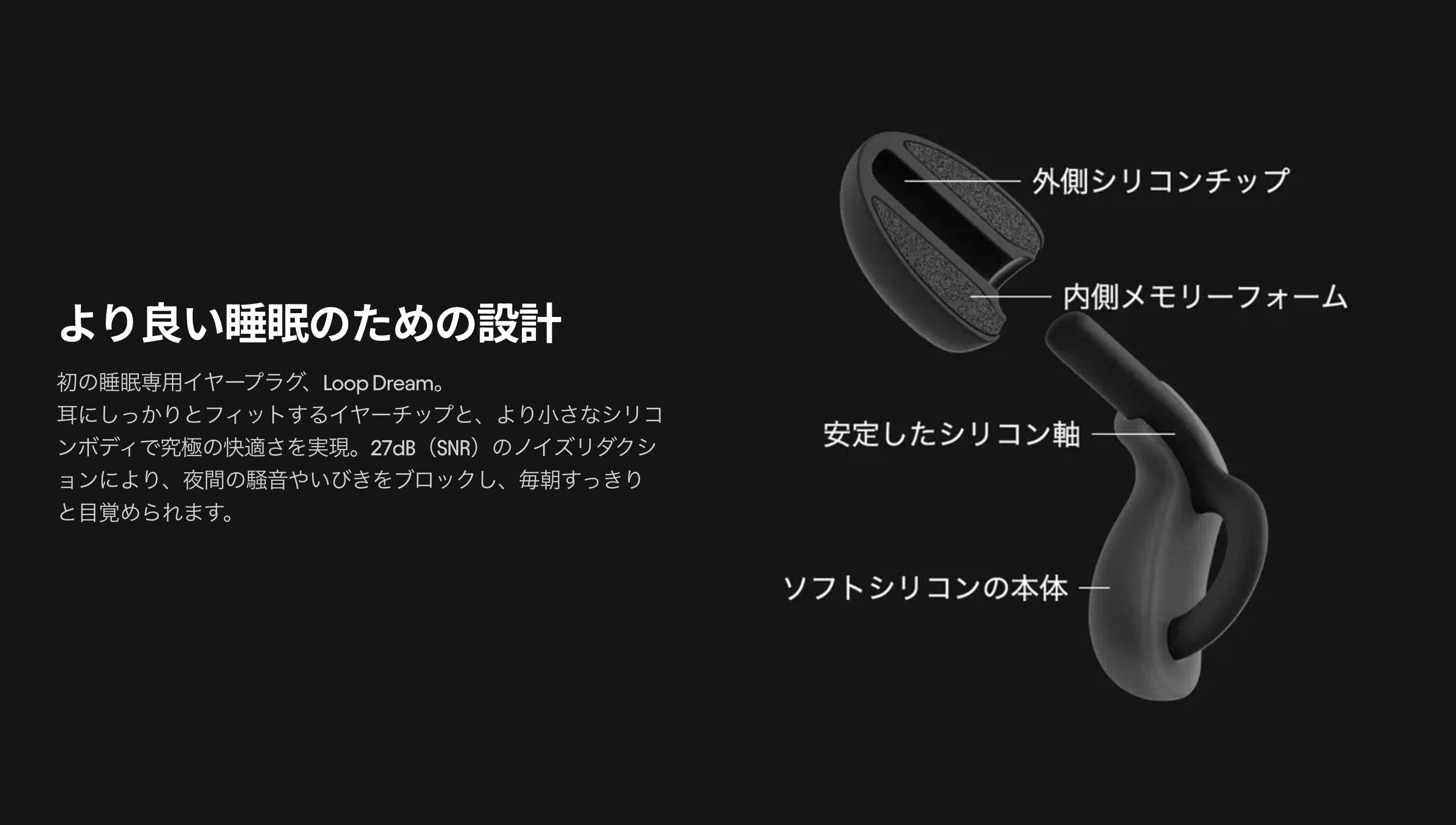 Loopは2016年にベルギーで誕生したイヤーウェア専門ブランド。リング状のアイコニックなデザインと高いノイズリダクション性能で世界150 か国以上にユーザーを広げています。その中でも 「Loop Dream」 はブランド初の“睡眠特化モデル”。柔らかなシリコンボディと楕円形メモリーフォームチップにより、横向き寝でも耳が痛くならない装着感と 27 dB(SNR) の遮音性能を兼ね備えています。