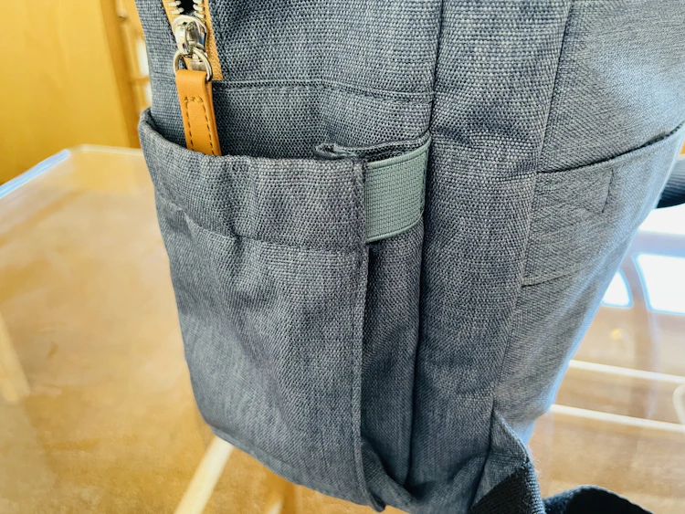 リュック両側面についている再度ポケットで、中に小型のポケットが複数あります。上側の布地ポケットにサングラスを入れたり、なくしたくないものをチェーンで繋いで中に入れたりしています。その他、ティッシュやリップもここに放り込んだりしています。