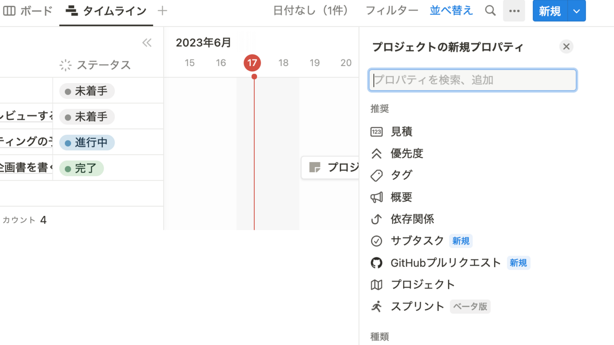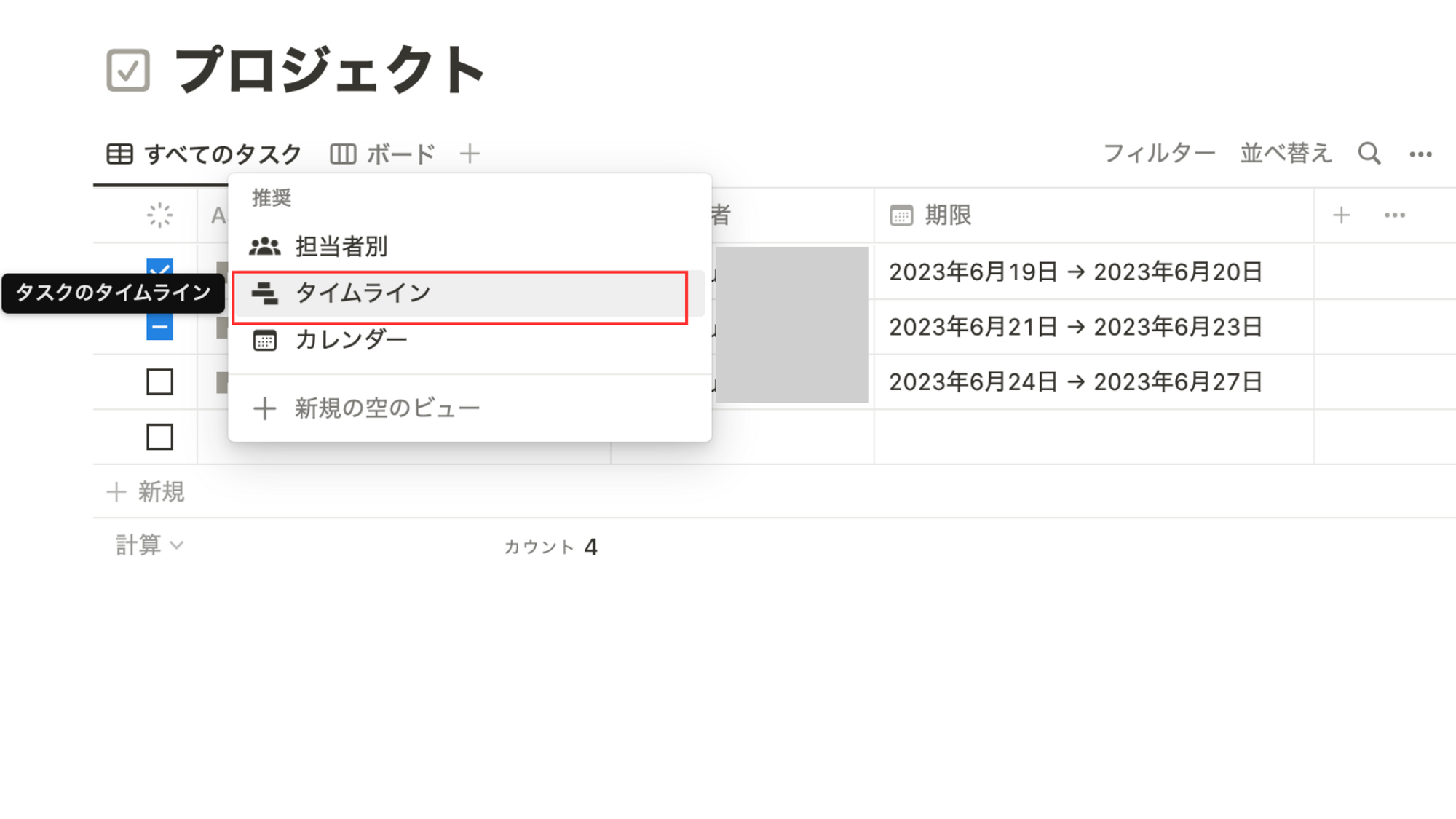 表の上部にある「+」ボタンよりビューを追加することができます。ガントチャート形式で表示させるには「タイムライン」を追加します。
