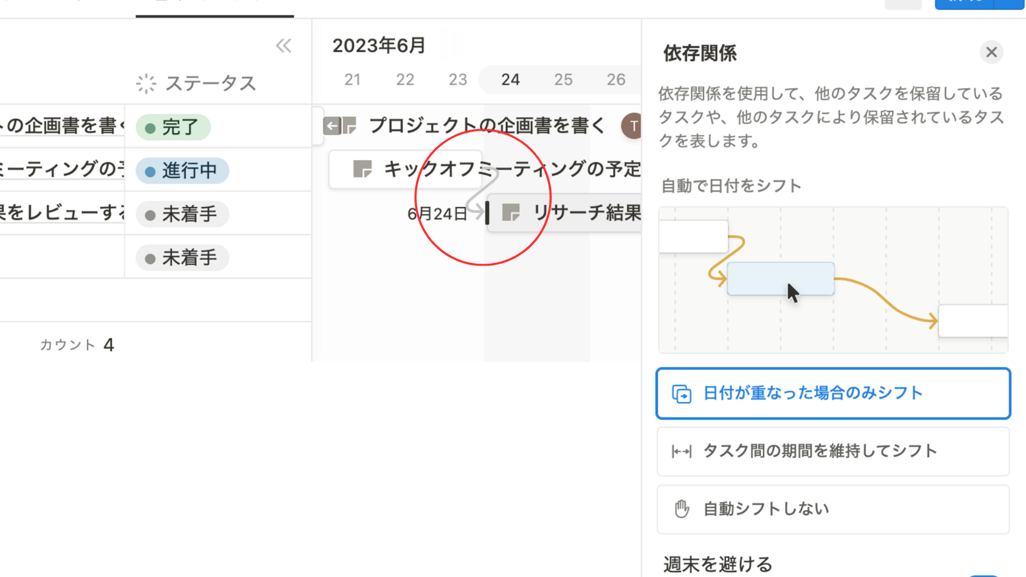 また、グラフの右端をクリックしたまま別のグラフまでドラッグすると、タスク間の依存関係を設定することができます。わざわざ依存関係を入力する必要がないので簡単ですし、直感的に操作できてわかりやすいですね。