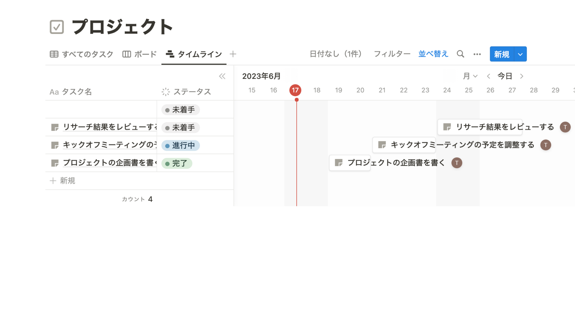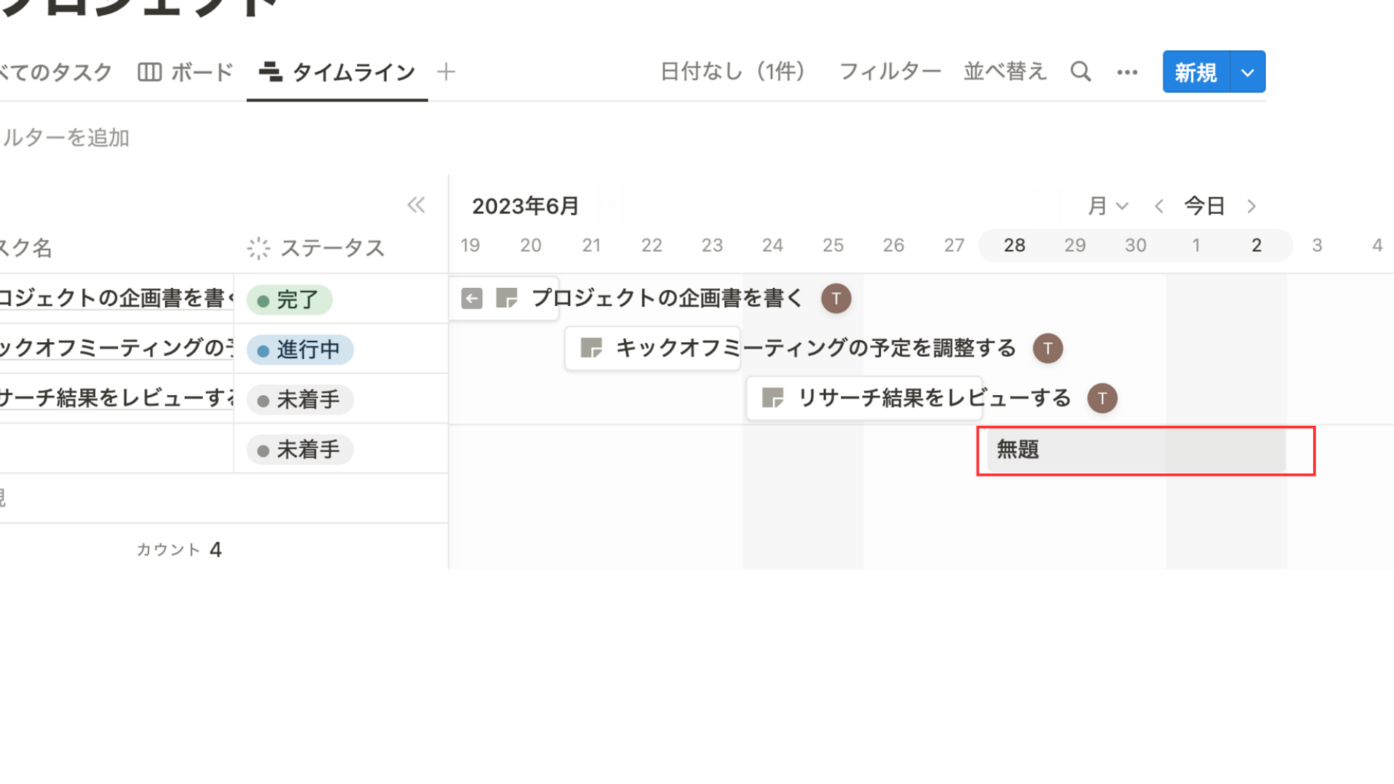 Notionでは、ガントチャートのように横軸にグラフで期間表示させる機能を「タイムラインビュー」と呼びます。ここではタイムラインビューを使って簡単にガントチャートを作成する方法を画像で解説します