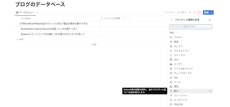 データベースに文字数用の列を追加し、プロパティの種類で「数式」を選択します。