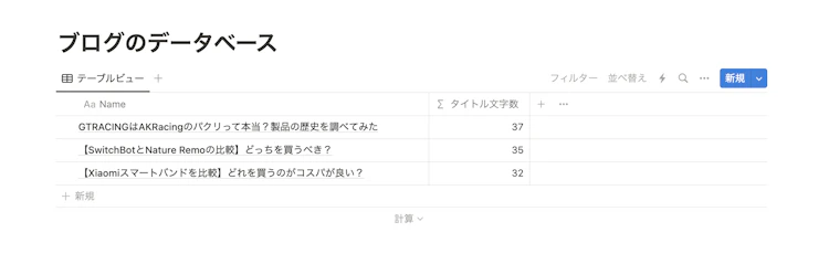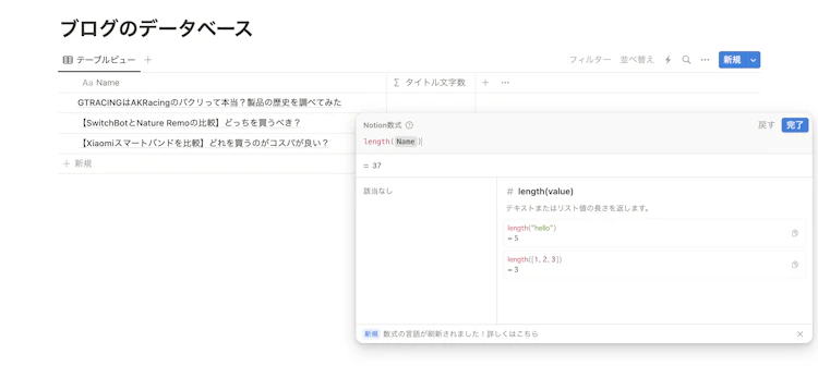 Ctrl + Shift + yCmd + Shift + yページ本文に入力した文字は上記の拡張機能を利用することでしか文字数をカウントすることができないのですが、データベースに追加したページ(正式な名前がわからない)のプロパティに入力した文字列は数式を活用することで文字数をカウントすることができます。