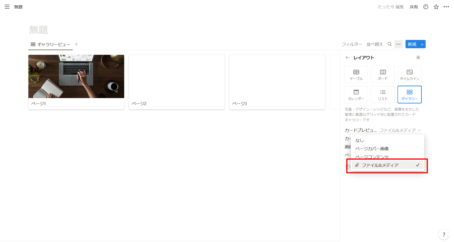 ギャラリービューの設定から、レイアウトを選択し、「カードプレビュー」を「ファイル&メディア」プロパティに設定した列の名前にします。