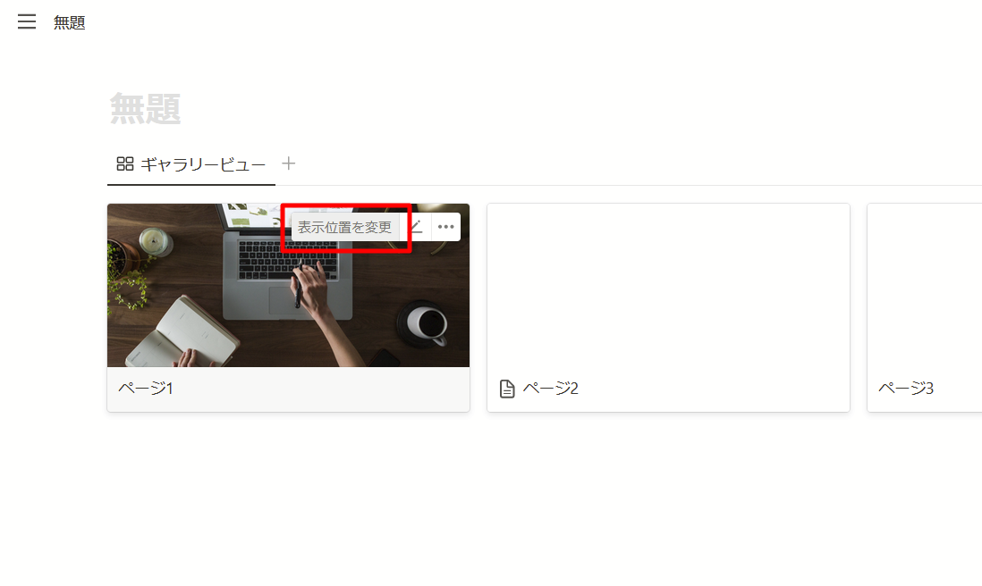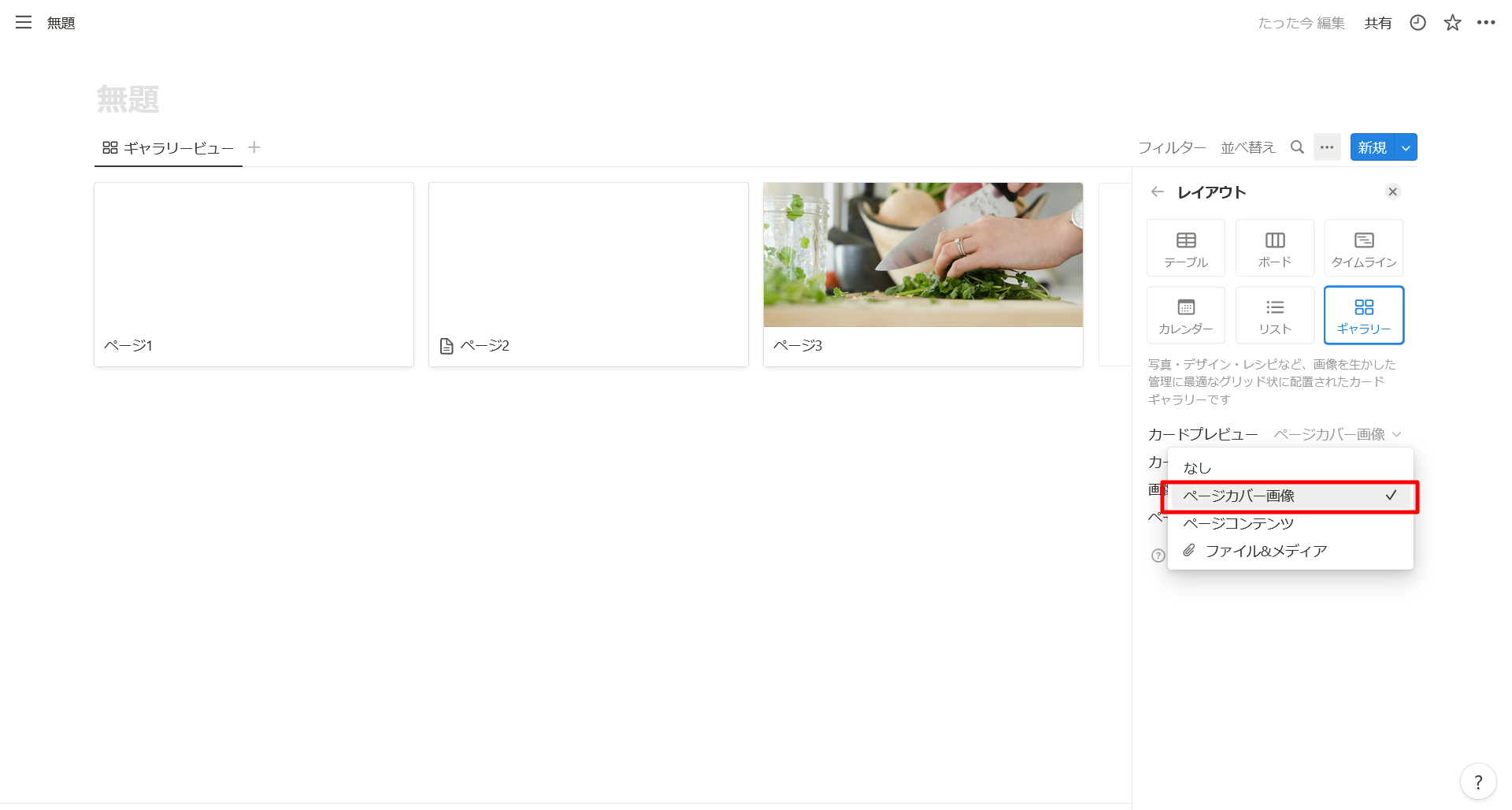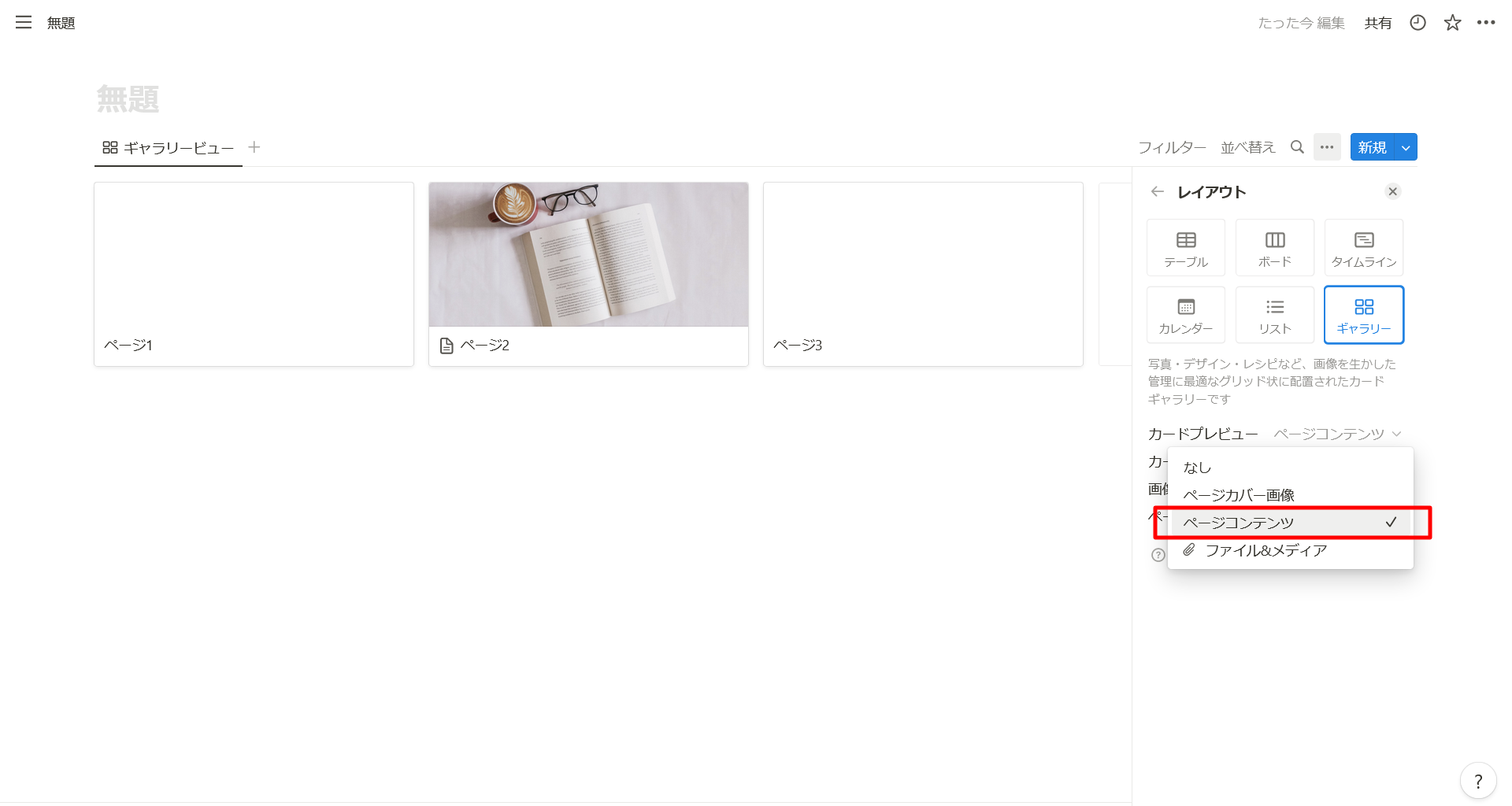 先ほどのギャラリービューの設定で、「カードプレビュー」を「ページコンテンツ」にします。