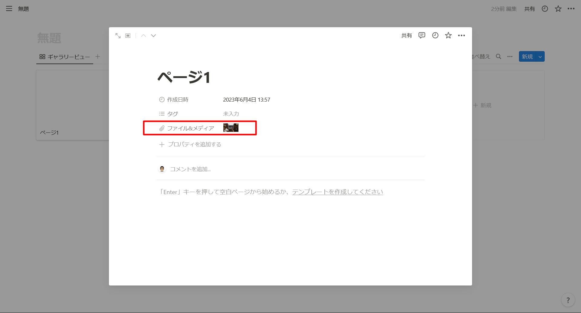 「ファイル&メディア」プロパティは、ファイルをアップロードしたり、リンクを埋め込んだりして画像やファイルを格納できるプロパティです。ページのコンテンツに「ファイル&メディア」プロパティを追加し、PCに保存されている画像などをアップロードします。
