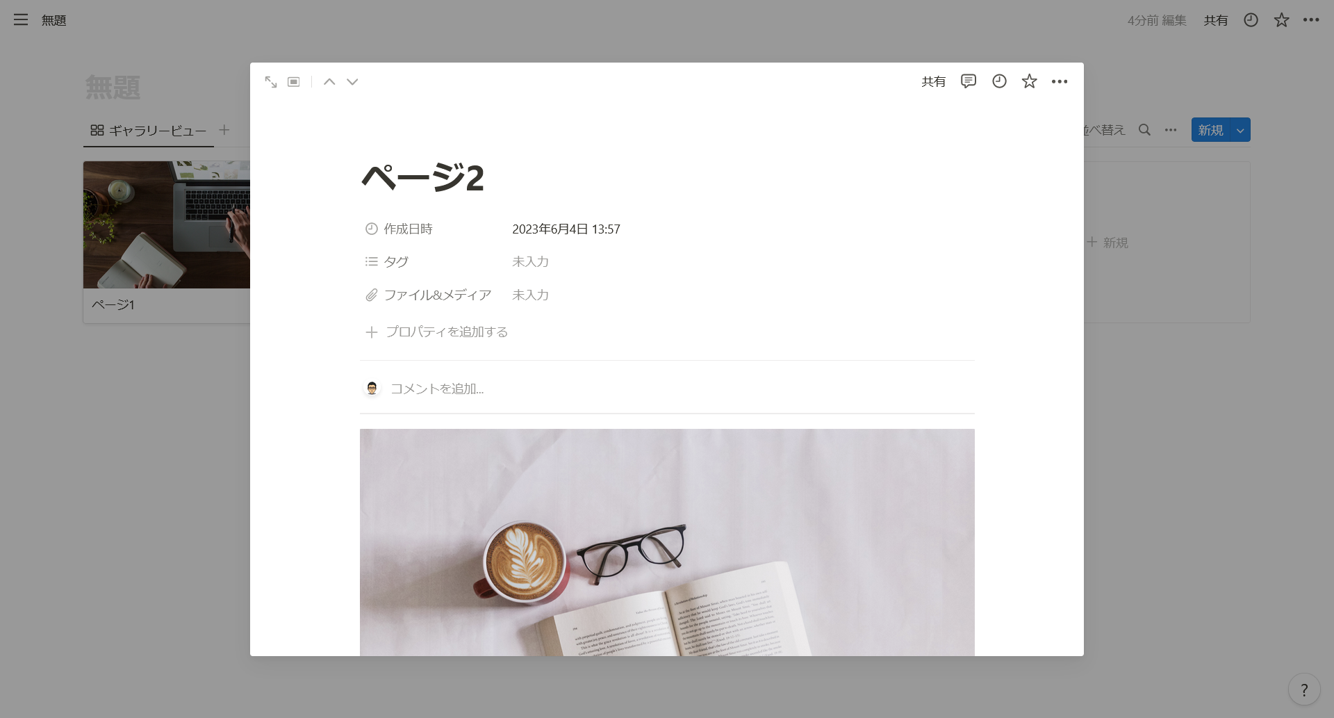 (ほかの形式と同じように)カードをクリックすると詳細ページに移動することができます。詳細ページでは、カードの項目以外にも、テキストや画像、チェックリストなどを追加することができます。詳細ページは、Notionの通常のページと同じように編集できますし、他のページともリンクできます。例えば、レシピのカードをギャラリーで表示するときに、カードには料理名や画像、材料や時間などの項目を入れておき、カードをクリックすると詳細ページに移動して、作り方やコツなどを書くことができます。