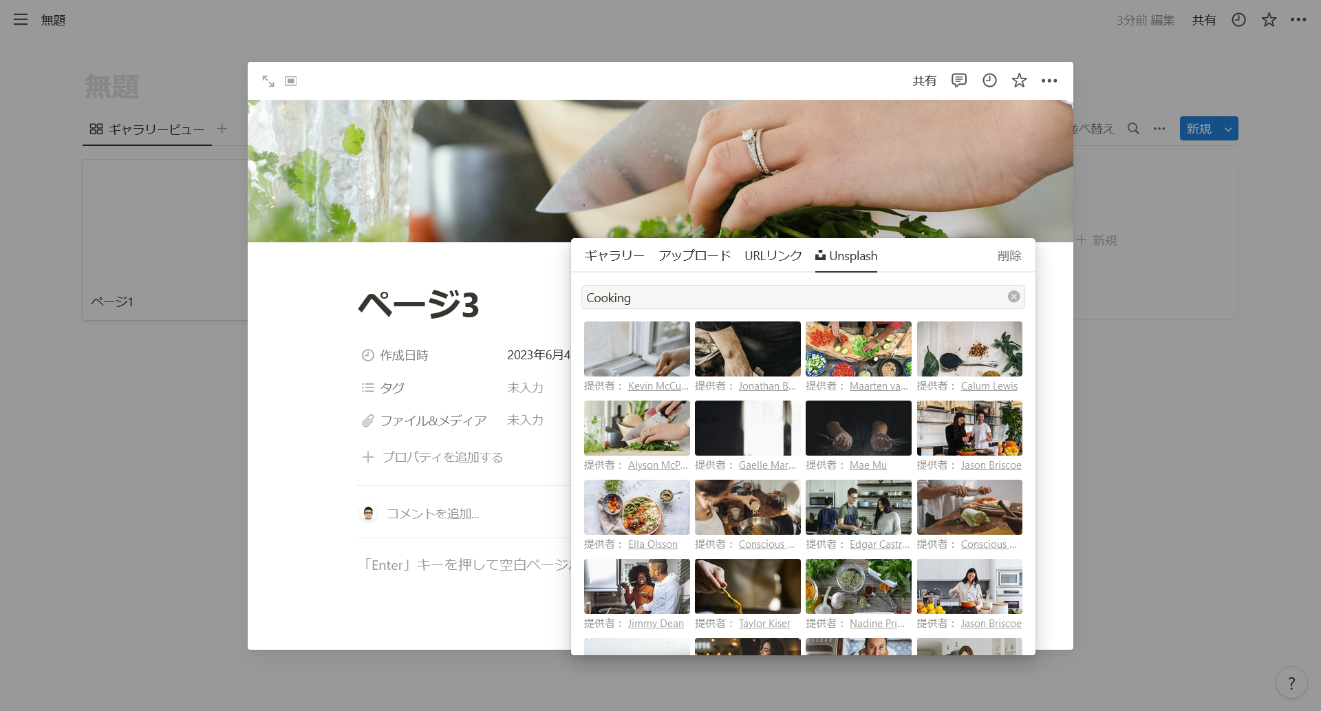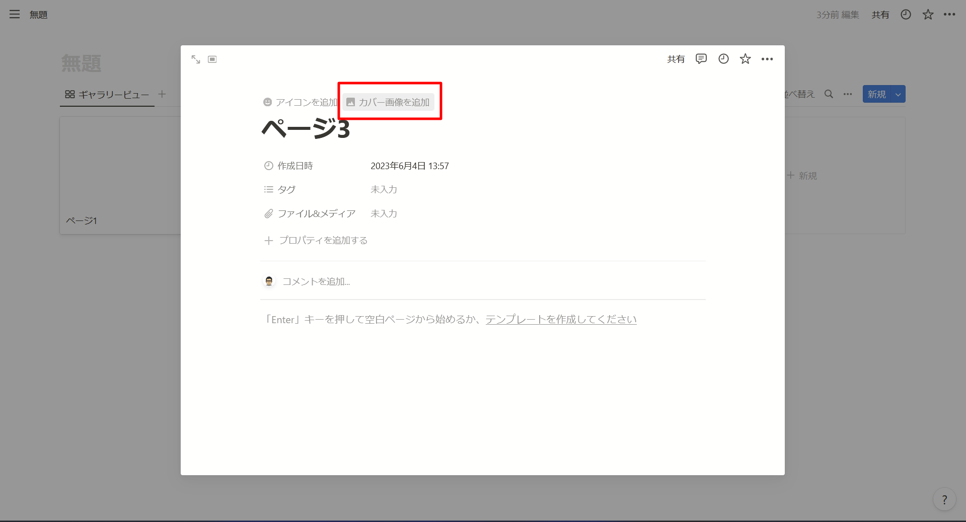 カバー画像とは、ページの上部に設定できる背景画像のことです。赤枠部分を選択し、画像を選択します。画像は自分でアップロードするか、Unsplashから選ぶことができます。