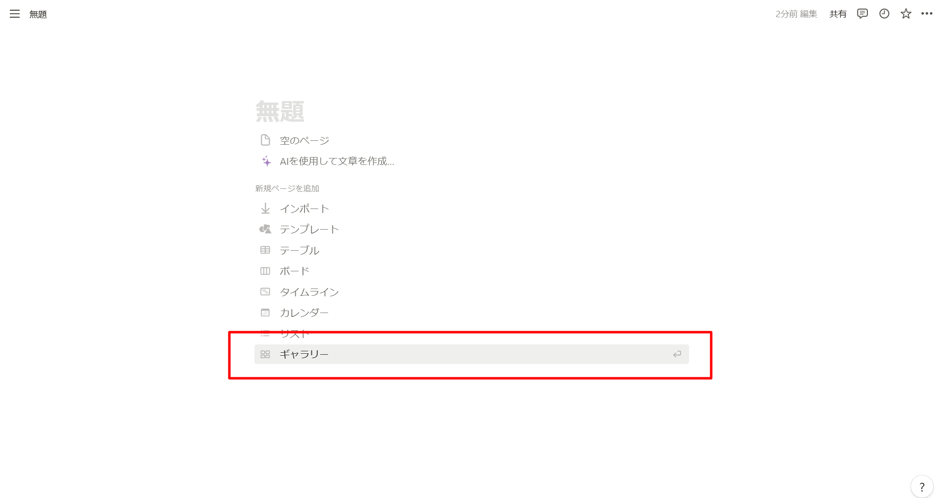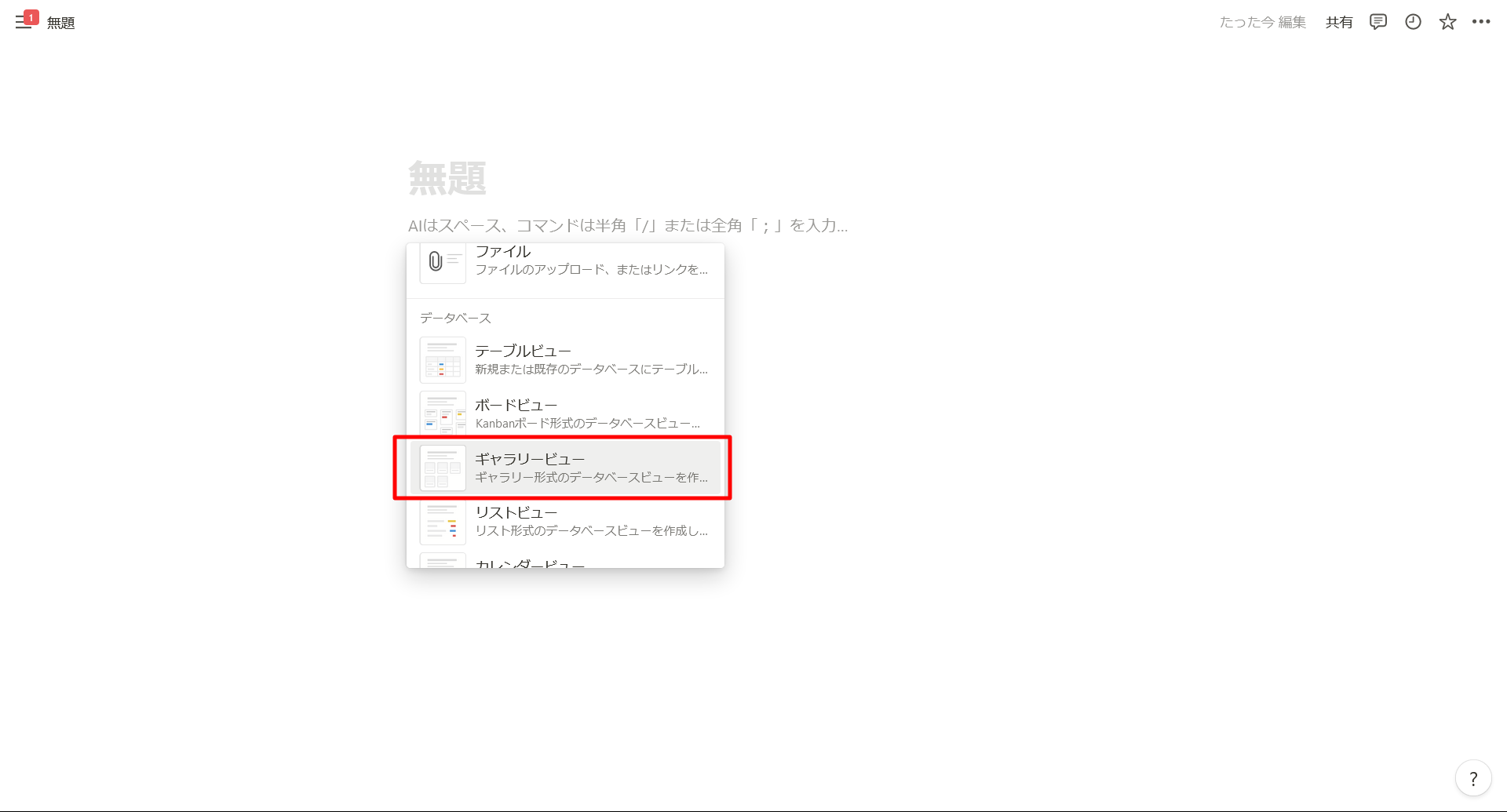 また、(以下の画像のように)既存のページ内でも、「+」ボタンからギャラリービューを選択することで、挿入可能です。