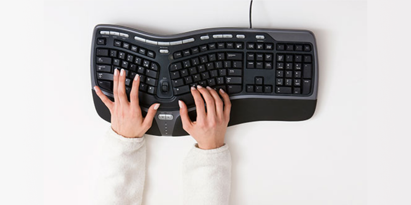 湾曲型のキーボードとはこのような形状のキーボードで、人間工学に基づいてデザインされてるので、人間の身体にとって負荷のかからない体勢でタイプできます。